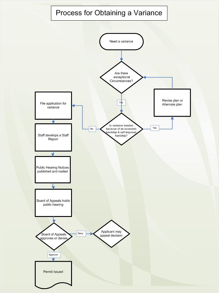 Any property owner who has been denied a building or development permit due to violation of dimensional standards has a right to request a variance. The petition for a variance must be heard by the Board of Appeals at a public hearing. Please contact the Department of Community Development at (262) 786-8610. Applications and guidelines are available at the department office: